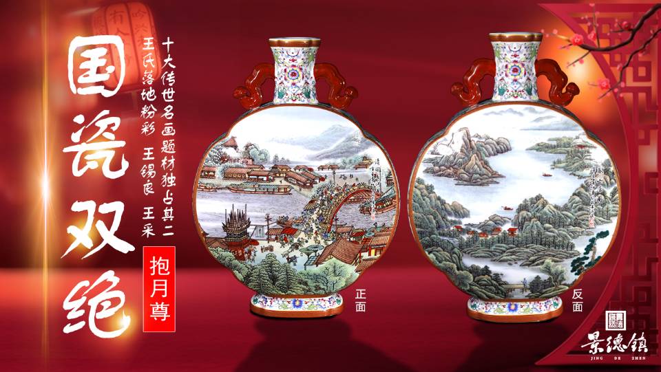 抱月瓶是清代的一种瓷器。亦称“宝月瓶”。圆口阔腹 雍容华贵,收口滑肩,硕腹圈足,乃中国传统经典器型,备受帝王宠爱。抱月瓶属于镶器和原器的结合器形,这种造型非常难烧制,非常容易变形,是景德镇器形中受欢迎的造型。百岁瓷王王锡良大师这尊《国瓷双绝》抱月尊以抱月瓶为造型,把十大传世名画的清明上河图和富春山居图为主图重新构图,粉彩和珐琅彩的完美融合,是百岁瓷王得意的一件经典作品。