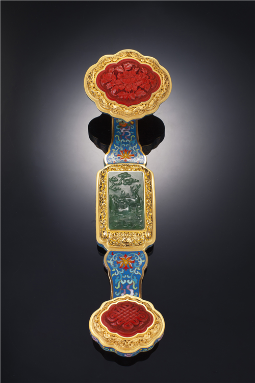 吉祥如意非遗臻藏《盛世鸿福如意》特邀四位中国工艺美术大师联袂打造,分别为:国家级景泰蓝工艺大师刘永森、中国玉石雕刻大师王希伟、非遗漆雕代表性传承人李志刚、花丝镶嵌代表性传承人赵春明。四位大师将景泰蓝、玉雕、漆雕、花丝融会贯通、相映成辉,以故宫馆藏铜镀金累丝为原型,是一件集工艺之美、创作之美、寓意之美的非遗艺术佳品。