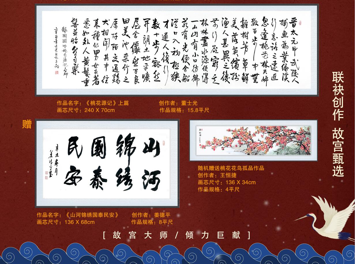故宫文物书画修复大师王恒涛协手中国美术家协会会员、李苦禅再传弟子王恒捷共同创作15.8平尺《山河锦绣·桃花盛开》大型国画山水作品,与同尺寸董士光大师《桃花源记》书法作品。赠送王恒捷老师4平尺桃花题材花鸟画一幅,再赠送故宫资深文博专家姜德平手书8平尺《山河锦绣国泰民安》书法,全套主品+赠品4幅书画精品共43.6平尺统统抱回家!