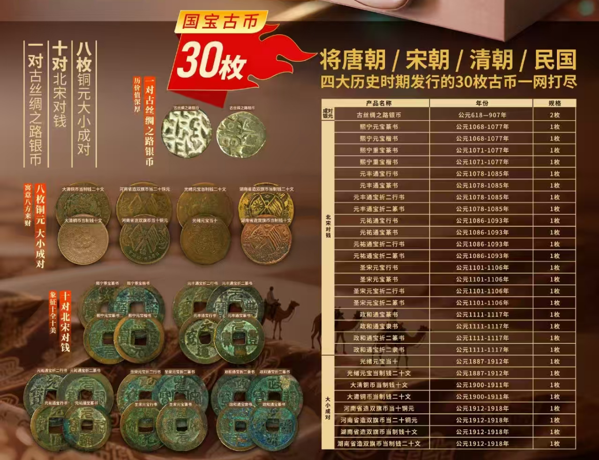 单枚难得,成对难求!《国宝三十珍》15对古币珍藏,将银元、铜钱、铜元3大板块、唐朝宋朝清朝民国4大历史时期,熙宁、元丰、元祐、政和、光绪”5种年号钱;1对古丝绸之路银币,10对北宋对钱,8枚铜元大小成对,30枚古币奇珍尽收囊中。更有恒实鉴定封装保真,让您藏着绝对放心!