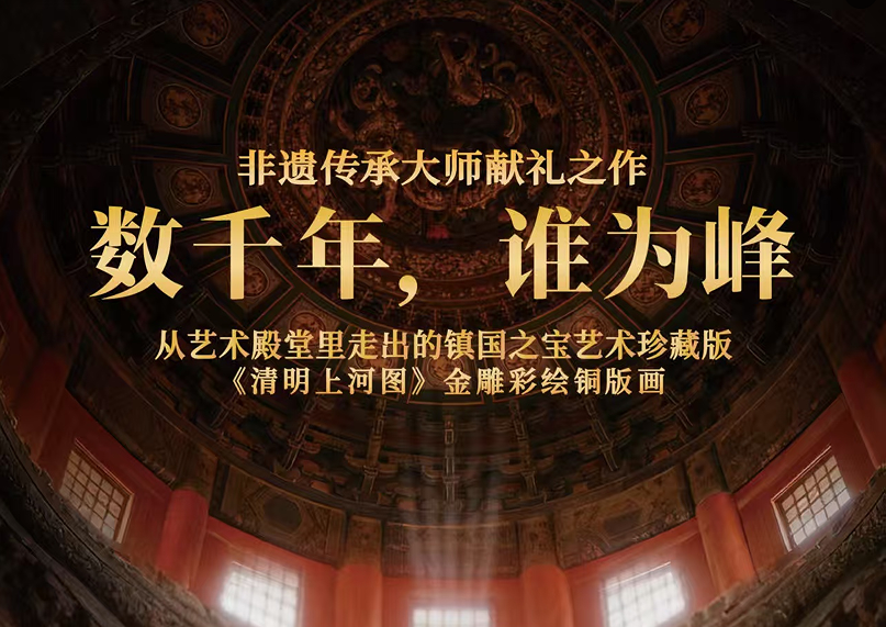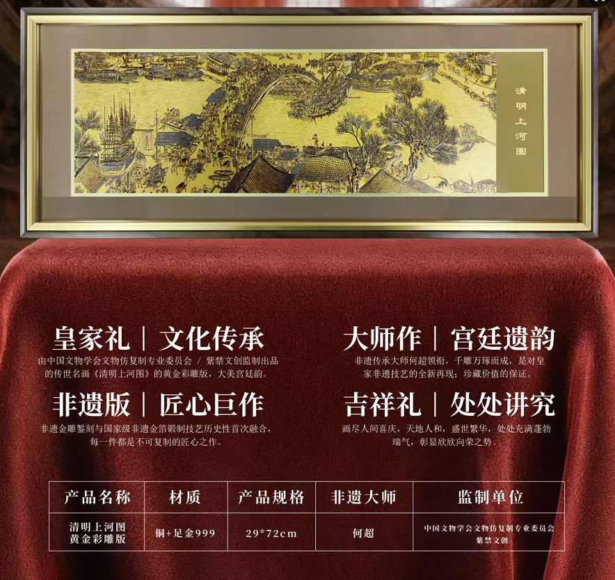 金雕画创始人、非遗传承大师何超匠心之作《清明上河图》金雕彩绘铜版画,中国文物学会文物仿复制专委会联合紫禁文创监制,对清明上河图进行等比例完美金雕再现,并结合非物质文化遗产南京金箔锻造技艺打造极具艺术经典和收藏价值的《清明上河图》金雕版,打造从艺术殿堂里走出的镇国之宝非遗艺术珍藏版。