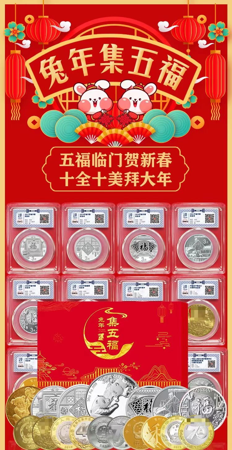 兔年集五福 6大银币+6大纪念币,包括熊猫银币、五大福字银币、六大国泰民福主题纪念币,五福临门十全十美,集法定货币、生肖文化于一体,值得拥有!藏兔年集五福12大银币纪念币套装,送崔永和大师书法墨宝《玉兔金丰》8平尺。
