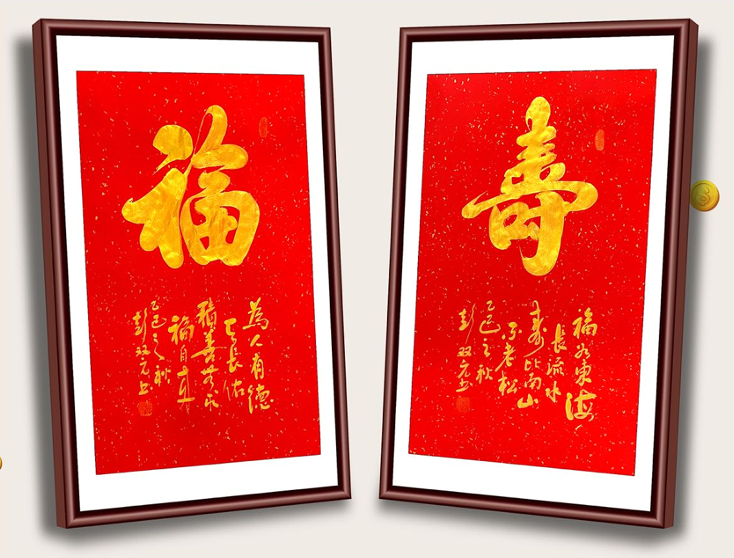 沙孟海传人彭双元大师《福寿双全》书法真迹 红色洒金宣纸金色墨汁福寿书法作品收藏送礼物