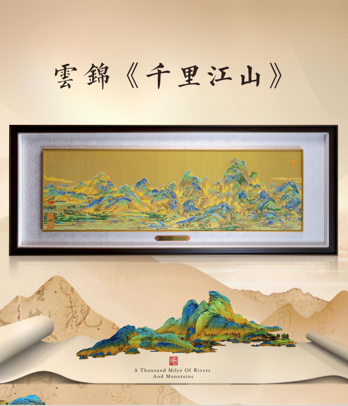 南京历代云锦博物馆特邀云锦国家级非物质文化遗产代表性传承人周双喜和南京云锦木机妆花手工织造技艺代表性传承人杨建顺两位大师,倾力创作云锦《千里江山》,带精美画框!以世界非遗云锦,展现了其在新时代的非遗文化传承与创新精神。