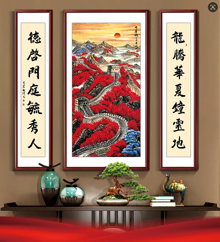张大千再传弟子、中央美院、北京画院共同培养的大师陈祖河手绘殿堂级国画珍品《钢铁长城-中华魂》中堂书画套组,内含8平尺《中华魂》一幅,配套4平尺书法对联一对,上联:龙腾华夏钟灵地;下联:德启门庭毓秀人。全套16平尺书画!托底配锦盒发货!