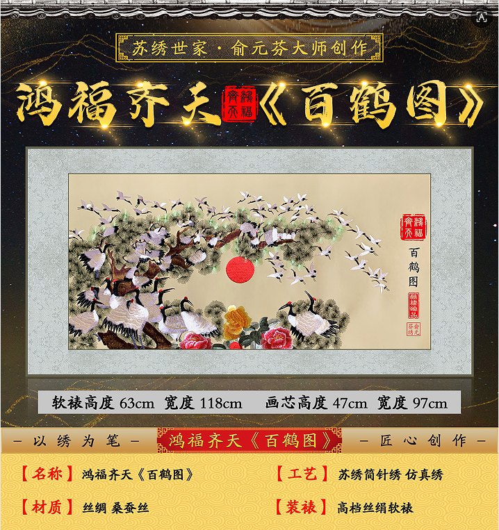 中华传统工艺大师、苏绣高级工艺美术师、苏绣技艺非遗传承师俞元芬老师,以明代画家边景昭百鹤图为蓝本创作——鸿福齐天《百鹤图》超大尺幅苏绣非遗艺术精品,罕见超大尺幅苏绣,以“仙鹤”和“古松”为主题,寓意吉祥!收藏送礼装饰皆宜!