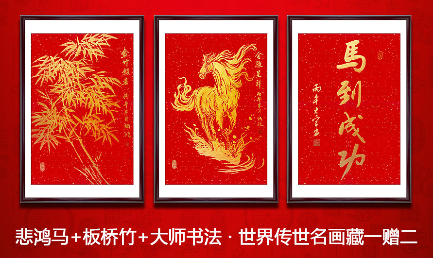 世界名画殿堂甄选《金骏呈祥踏竹韵》金墨书画套组 双大师三幅书画悲鸿马+板桥竹+马到成功