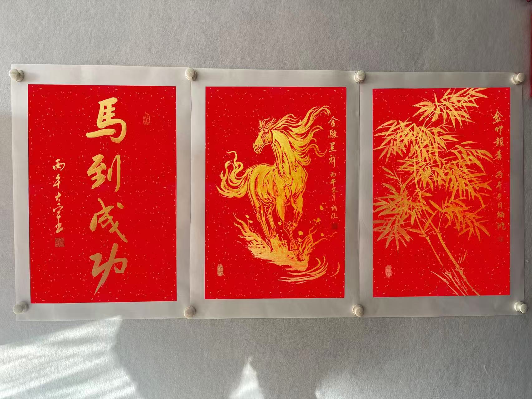 世界名画 殿堂甄选《金骏呈祥踏竹韵》金墨书画套组,两位大师,三大作品,画史一绝。魏丙欣大师以金墨创作悲鸿马《金骏呈祥》板桥竹《金竹报喜》两幅金墨绘画,宋宪宇大师以金墨创作《马到成功》书法墨宝。手绘书画真迹!抢藏从速!