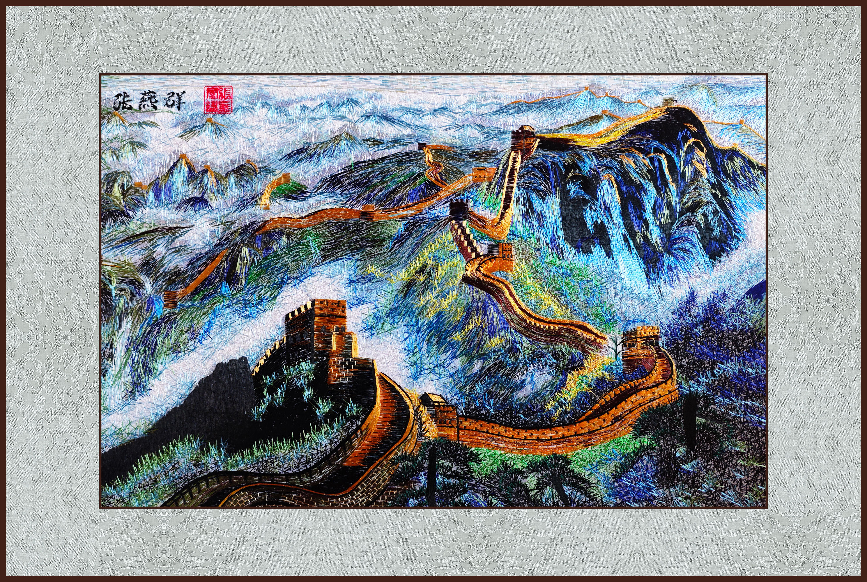 当代苏绣非遗传承人——张艳群大师精品苏绣【万里长城】满针满绣,气势如虹!大师精品苏绣【丹鹤晚霞】弦月映鹤,雅致吉祥!是大师非遗苏绣艺术收藏送礼物佳品!